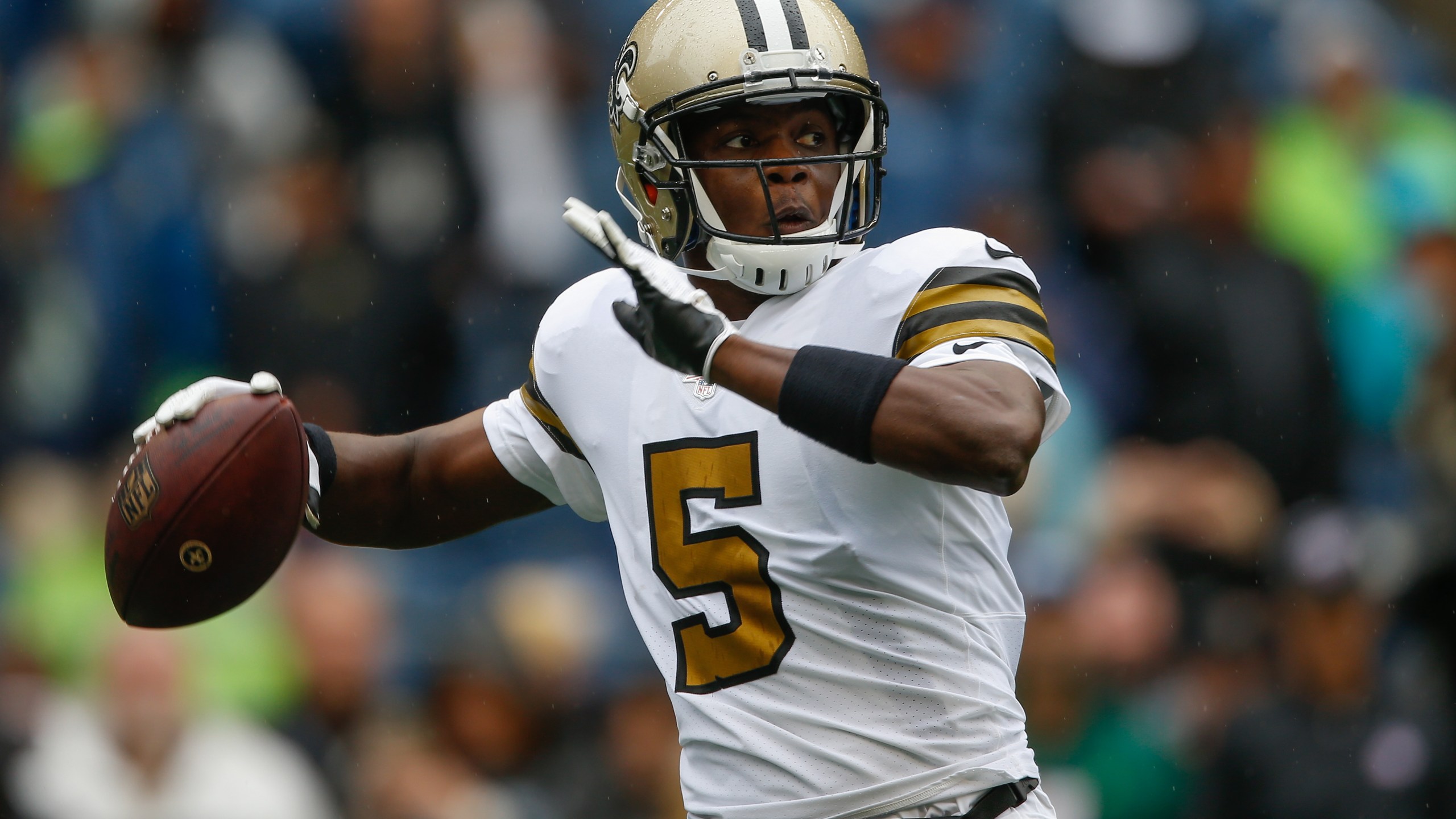SEATTLE, WA – SEPTEMBER 22: Quarterback Teddy Bridgewater #5 of the New Orleans Saints warms up prior to the game against the Seattle Seahawks at CenturyLink Field on September 22, 2019 in Seattle, Washington. (Photo by Otto Greule Jr/Getty Images)