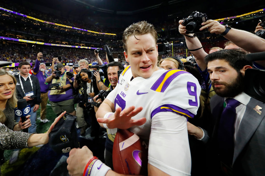 ATLANTA, GEORGIA – DECEMBER 07: Joe Burrow #9 of the LSU Tigers reacts after defeating the Georgia Bulldogs 37-10 to win the SEC Championship game at Mercedes-Benz Stadium on December 07, 2019 in Atlanta, Georgia. (Photo by Kevin C. Cox/Getty Images)